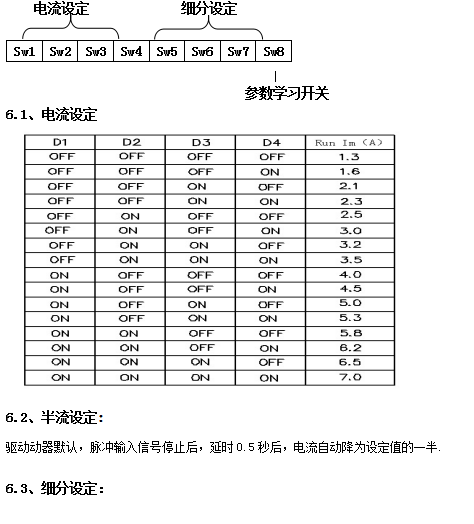 驅動器采用八位撥碼開關設定細分精度、動態電流、靜止半流以及實現電機參數學習與PID整定。八位撥碼開關詳細描述如下: