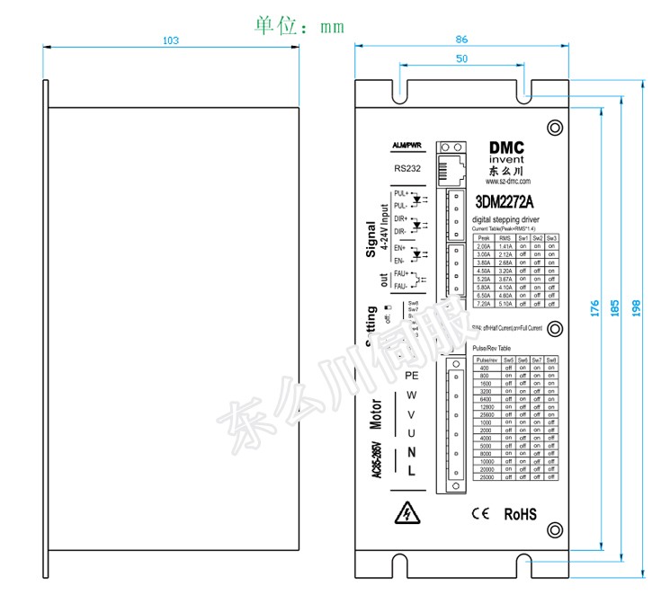 3DM2272A是基于DSP控制的高壓三相步進(jìn)電機(jī)驅(qū)動(dòng)器。它是將先進(jìn)的DSP控制芯片和三相逆變驅(qū)動(dòng)模塊結(jié)合一起所構(gòu)成的新一代數(shù)字步進(jìn)電機(jī)驅(qū)動(dòng)器。驅(qū)動(dòng)電壓為AC85V-220V,適配電流在7.2A以下、外徑86-130mm的各種型號(hào)的三相混合式步進(jìn)電機(jī)。該驅(qū)動(dòng)器內(nèi)部采用類似伺服控制原理的電路,此電路可以使電機(jī)運(yùn)行平穩(wěn),由于采用了平滑技術(shù),低速時(shí)幾乎沒有震動(dòng)和噪音,電機(jī)在高速時(shí),仍保持較大的力矩。定位精度最高可達(dá)25600步/轉(zhuǎn)。